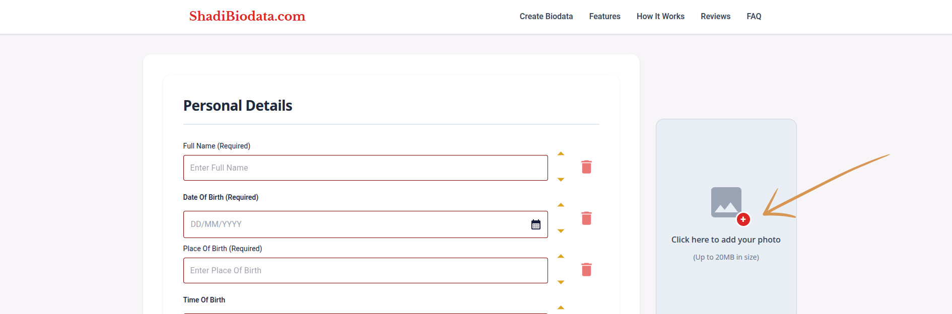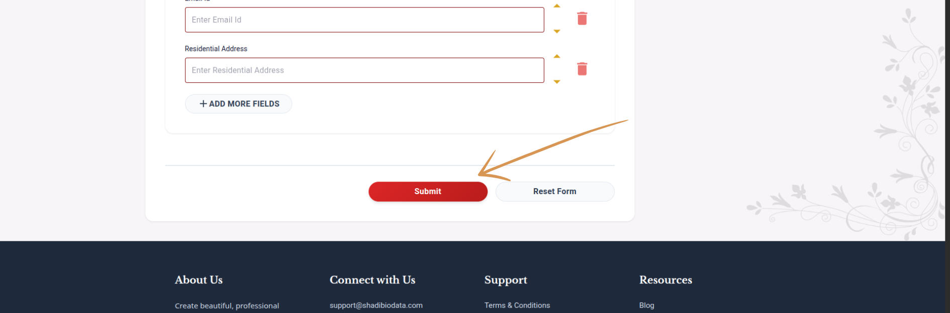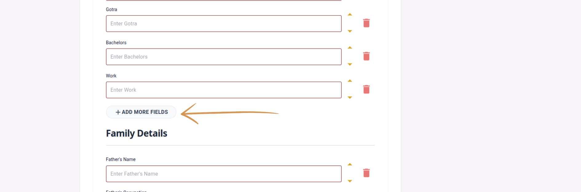 डीफॉल्ट फॉर्ममध्ये नसलेली माहिती जोडायची आहे का? "फील्ड जोडा" वर क्लिक करा आणि कस्टम एंट्री तयार करा — जसे छंद, अपेक्षा, गोत्र किंवा तुमच्यासाठी महत्त्वाचे काहीही.