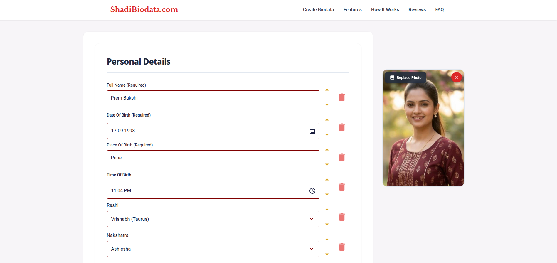 नाव, जन्मतारीख, उंची, रंग, धर्म, जात, मातृभाषा आणि इतर वैयक्तिक तपशील भरा. प्रत्येक फील्ड स्पष्टपणे लेबल केलेले आहे जेणेकरून काय भरायचे हे कळते.