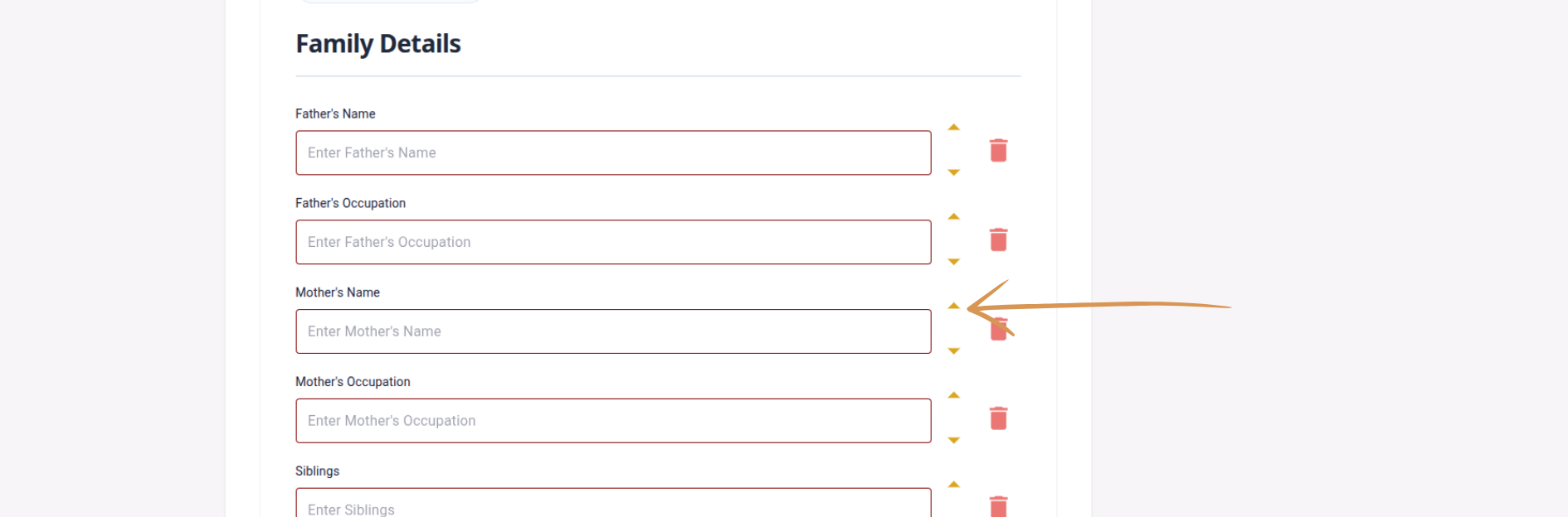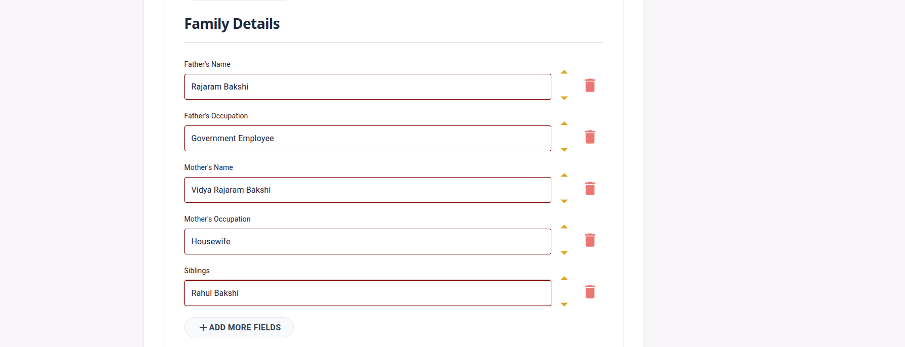 बाण बटणे वापरून फील्ड वर किंवा खाली हलवा. वडिलांचे नाव आईच्या नावाआधी यायला हवे? कोणतीही अडचण नाही — तुमच्या इच्छेनुसार बायोडाटा मांडा.